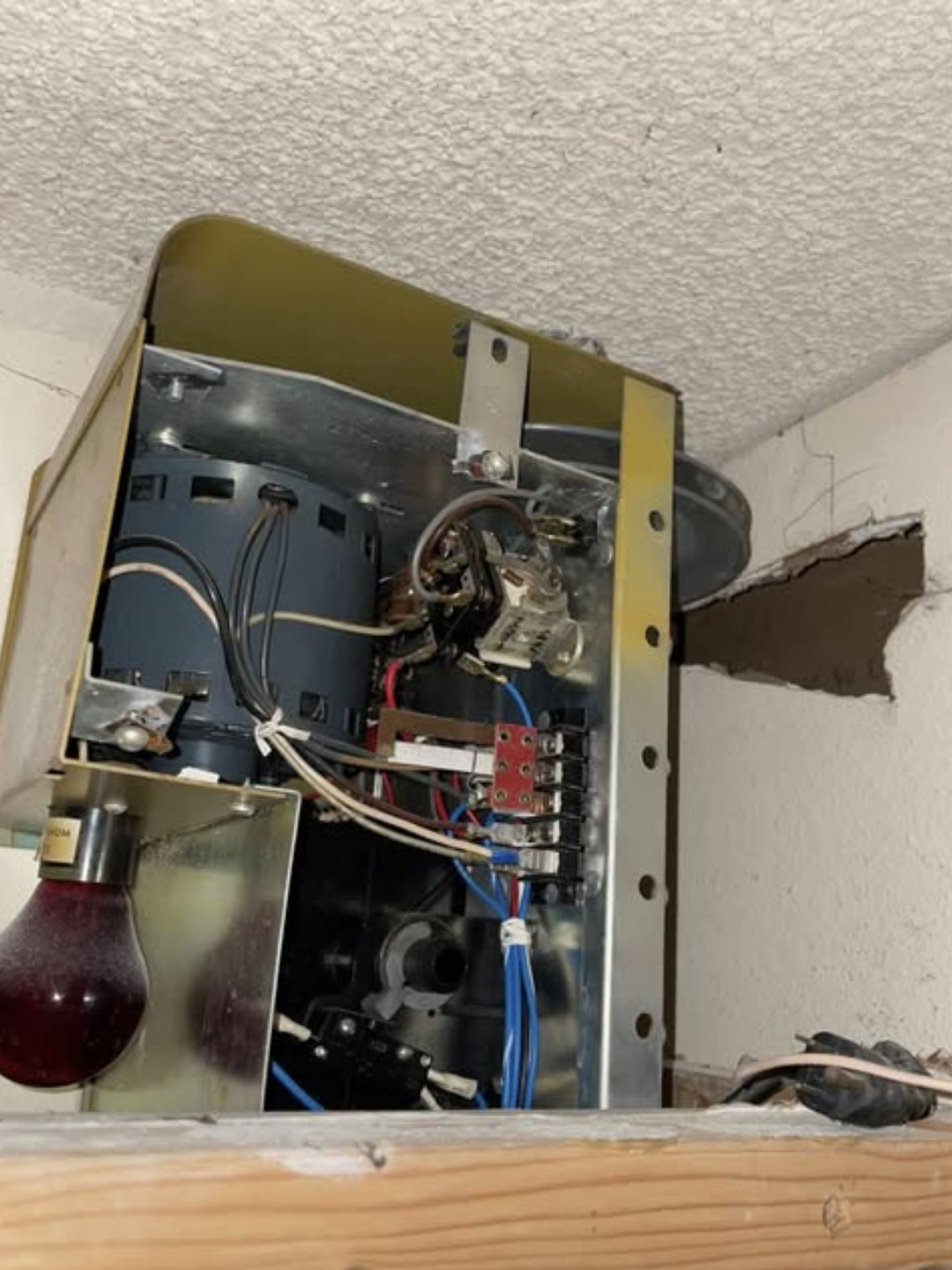 Wires dangle. A red “MEDIUM” bulb stares back at you like a sleepy eye.