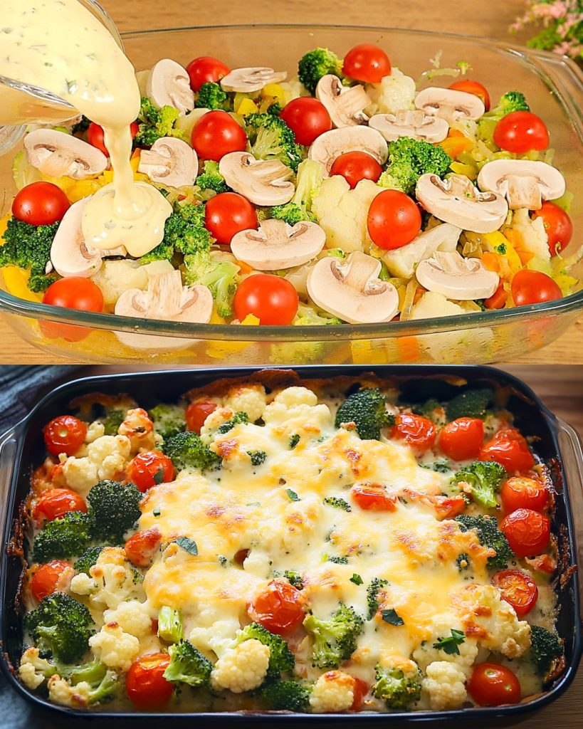 Arrange the broccoli, cauliflower, mushrooms, cherry tomatoes, and sautéed vegetables in a greased baking dish.
